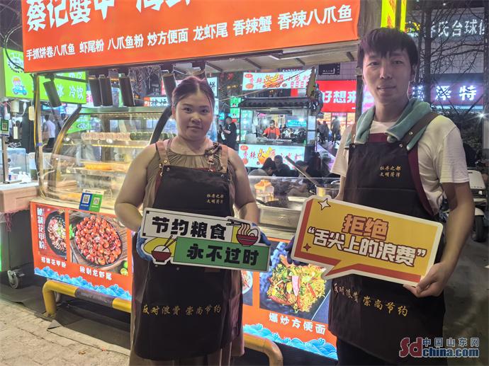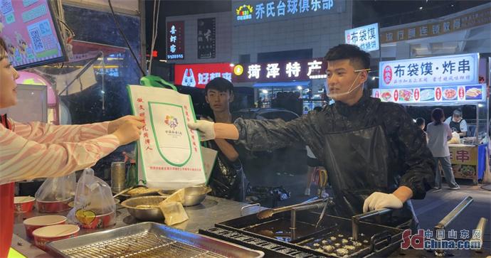活动中,工作人员通过打卡宣传的形式向夜市摊主、消费者宣传“崇尚节约 反对浪费”的思想理念,鼓励摊主要主动提醒消费者适量点餐不浪费,做好周边环境卫生清洁,号召市民群众无论在家吃饭、外出聚餐、还是点外卖,都要把“光盘”行动作为一种时尚,不浪费不攀比,合理膳食。同时,还向参与活动的夜市摊主、消费者赠送了印有“反对浪费 崇尚节约”字样的围裙、“文明摊位”“诚信经营”字样标识贴、“文明商铺”“菏泽文明20条”宣传页、手提袋、扇子等宣传品。