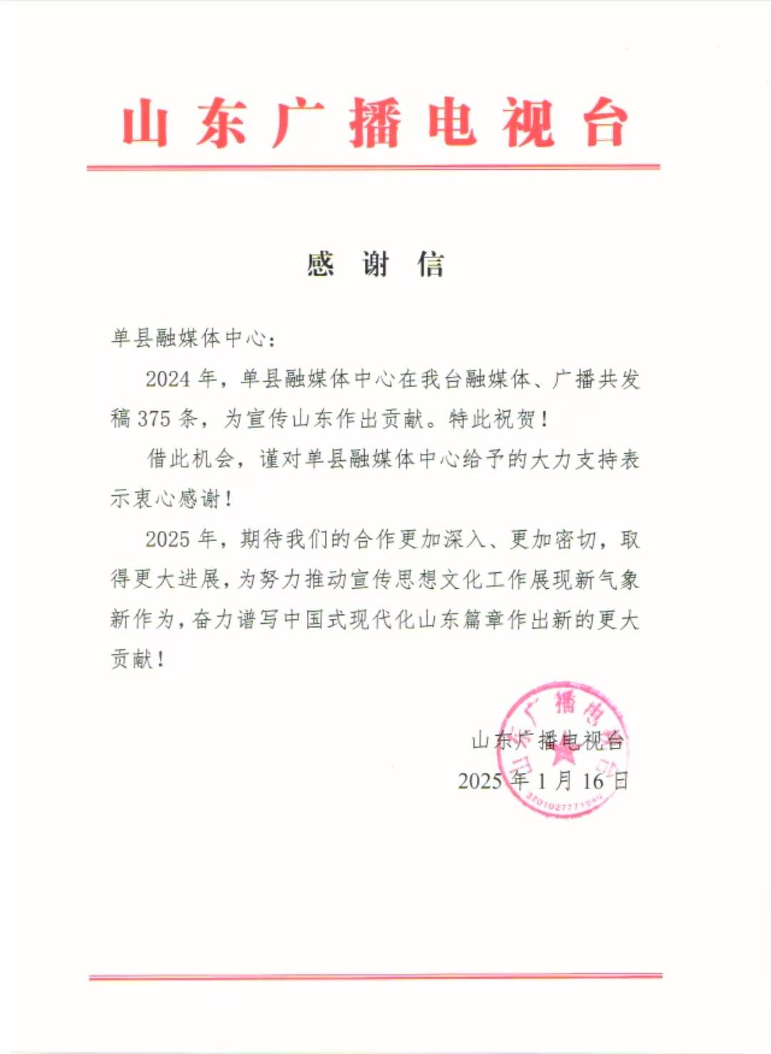 2024年,单县融媒体中心在我台融媒体、广播共发稿 375条,为宣传山东作出贡献。特此祝贺!