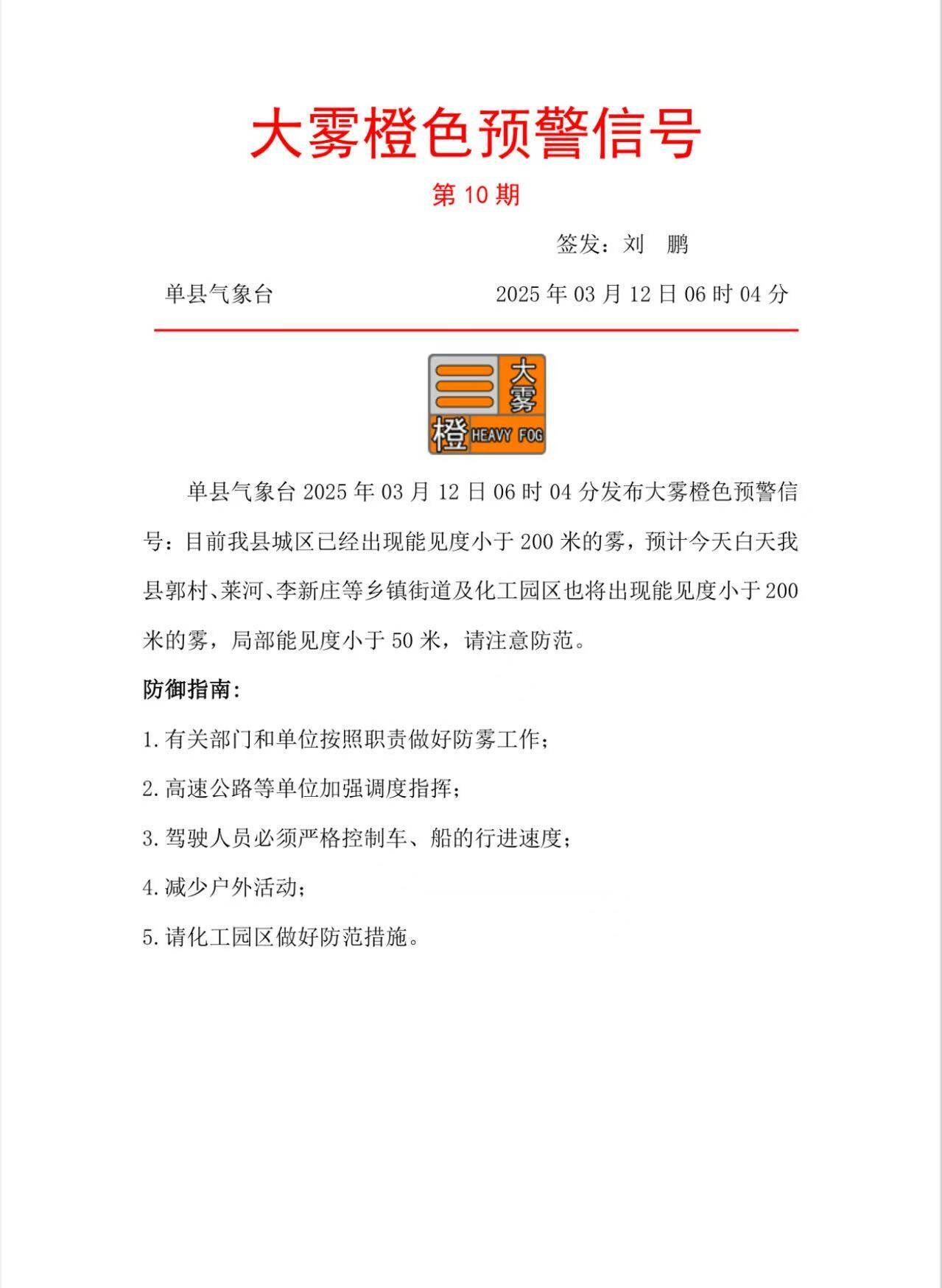 单县气象台 2025 年 03 月 12 日 06 时 04 分发布大雾橙色预警信号:目前我县城区已经出现能见度小于 200 米的雾,预计今天白天我县郭村、莱河、李新庄等乡镇街道及化工园区也将出现能见度小于 200米的雾,局部能见度小于 50 米,请注意防范。