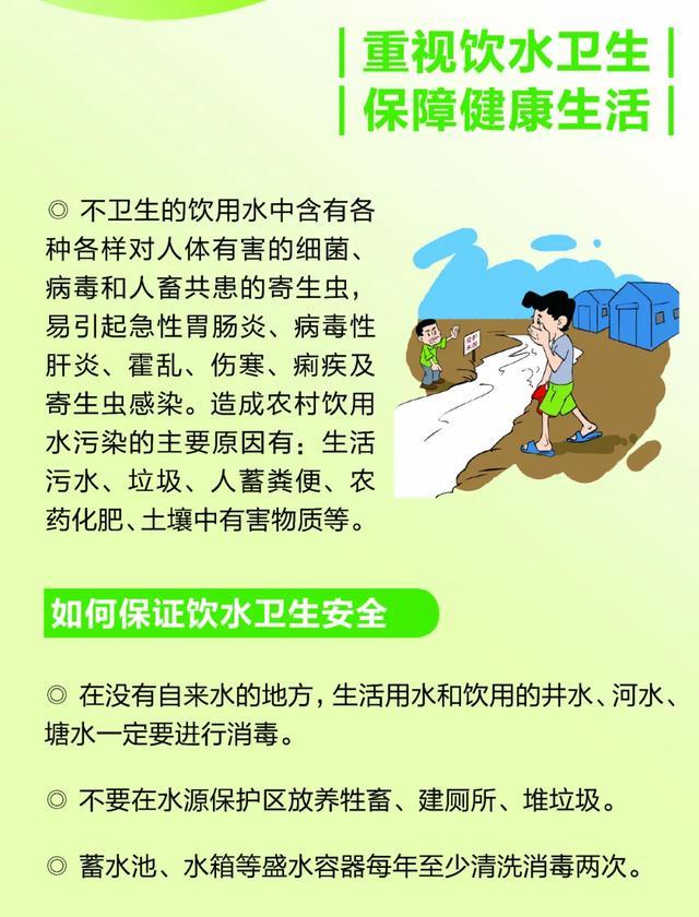 保障生活饮用水安全卫生,首先要保护好饮用水源。受污染水源必须净化或消毒处理后,才能用作生活饮用水。所以国家提倡居民使用自来水作为生活饮用水,避免使用不安全的井水、山水等。