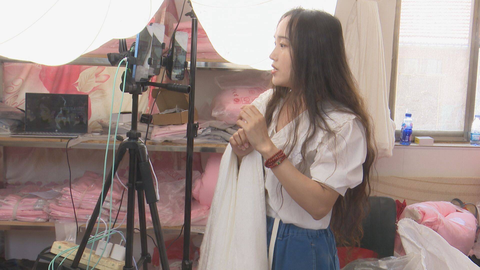 在莱河镇周庄村一家蚕丝被加工车间内,主播正在网络直播间内接受客户咨询,工人们则根据订单要求现场制作蚕丝被,很快一床床蚕丝被制作出来,从这里销往上海、江苏、浙江等地。