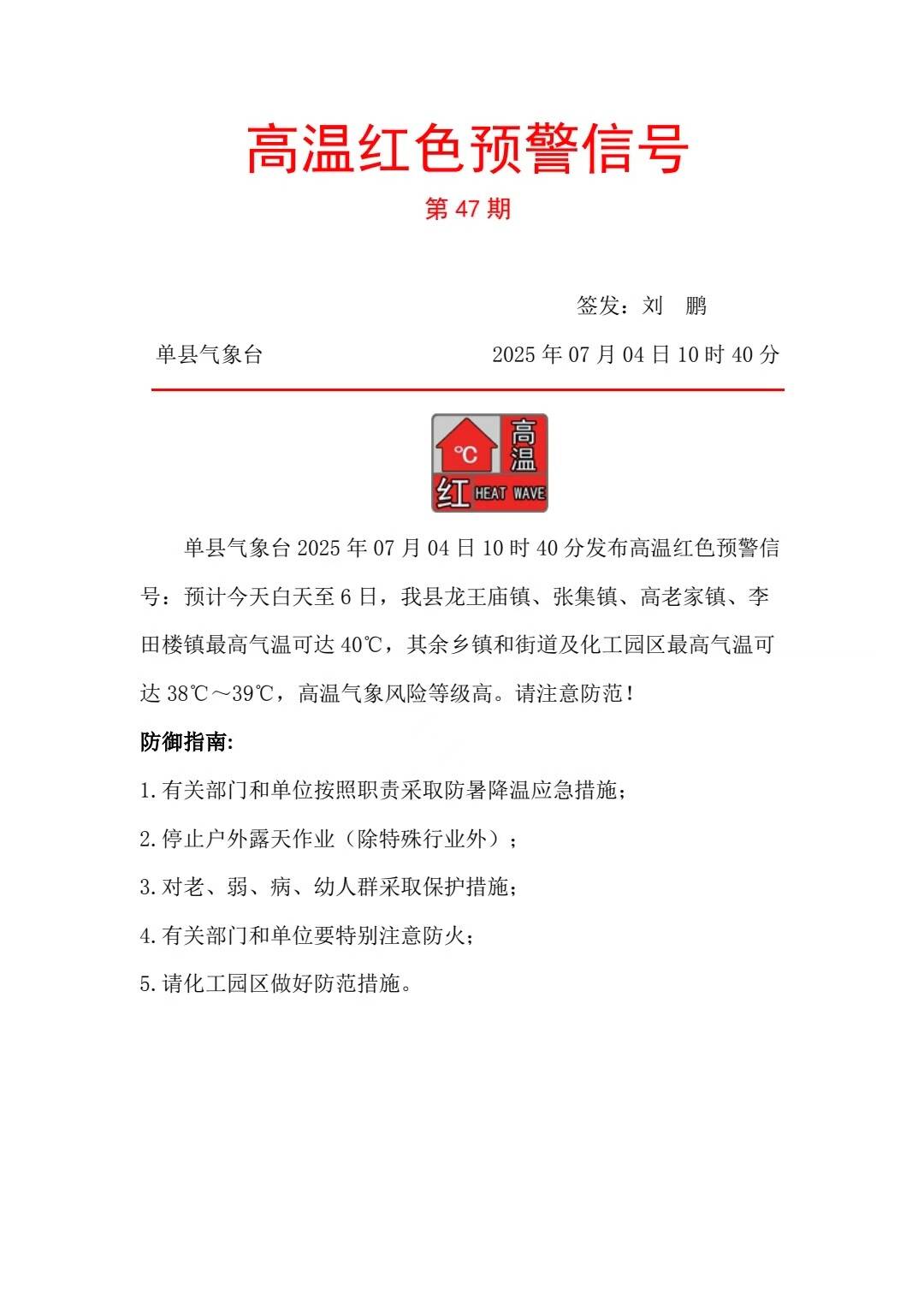 单县气象台2025年07月04日10时40分发布高温红色预警信号:预计今天白天至6日,我县龙王庙镇、张集镇、高老家镇、李田楼镇最高气温可达40℃,其余乡镇和街道及化工园区最高气温可达38℃~39℃,高温气象风险等级高。请注意防范!