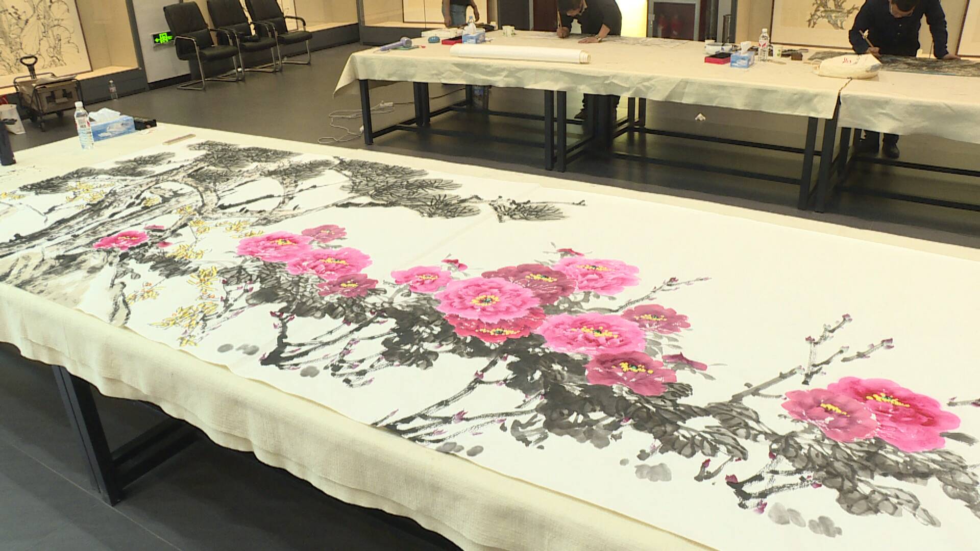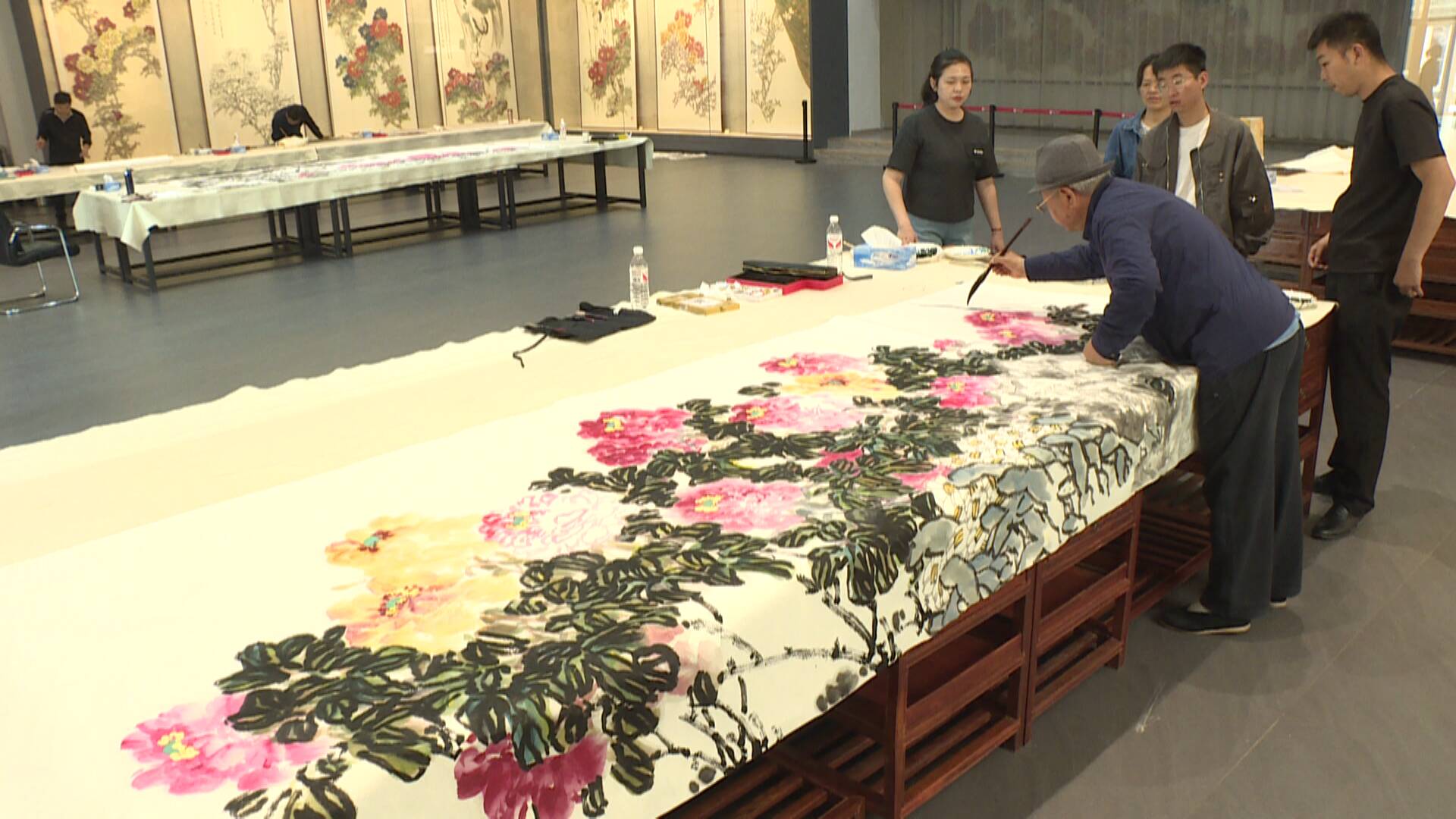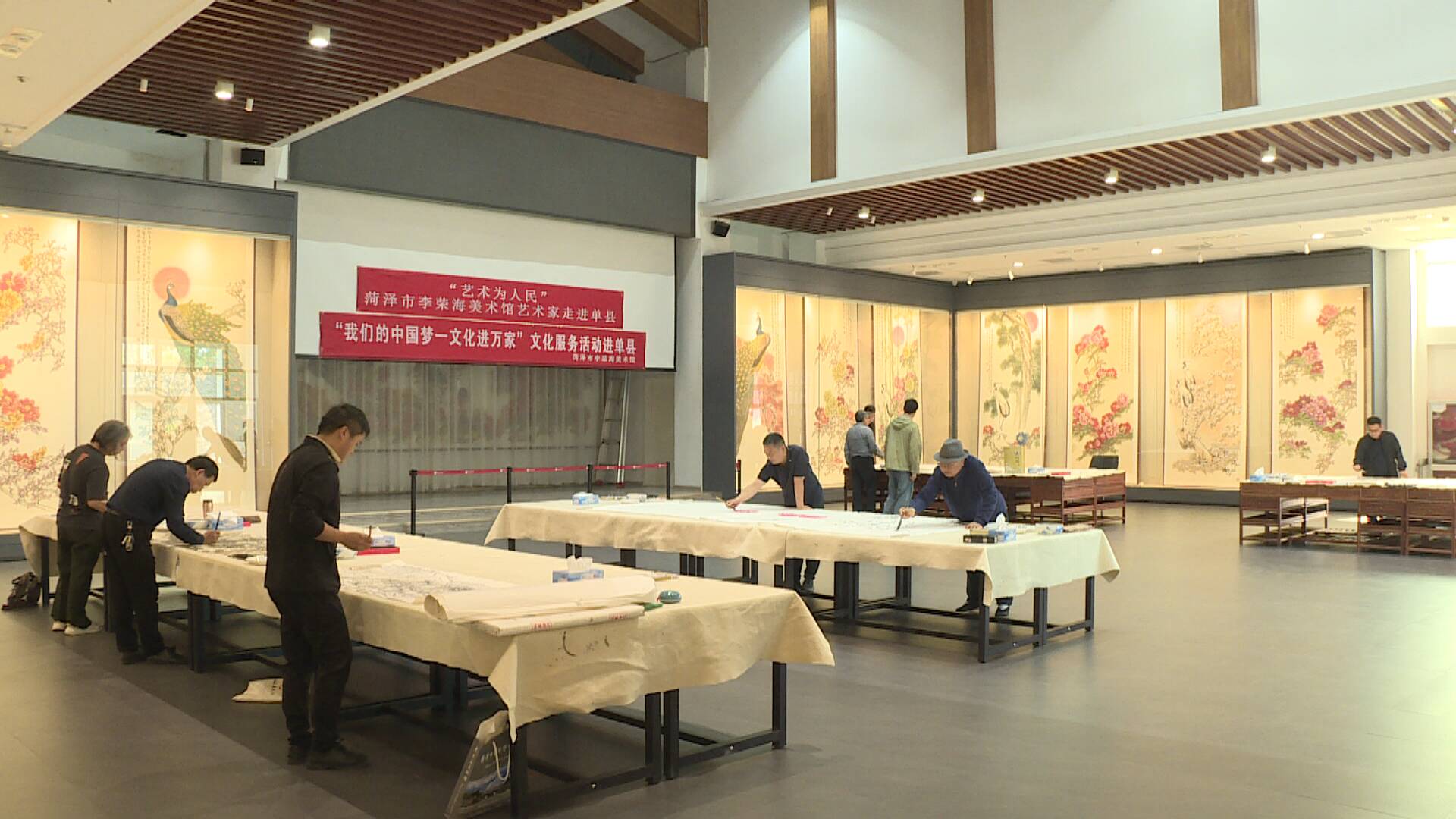 在美术馆中,李荣海等多位艺术家挥毫泼墨,用饱满的创作激情讴歌新时代。他们或描绘牡丹雍容华贵的盛世气象,或抒写山河壮美的时代新貌,创作了丈二匹国画《花开盛世》《万紫千红》和丈二匹书法等一批精美书画作品,为单县留下了精品力作。