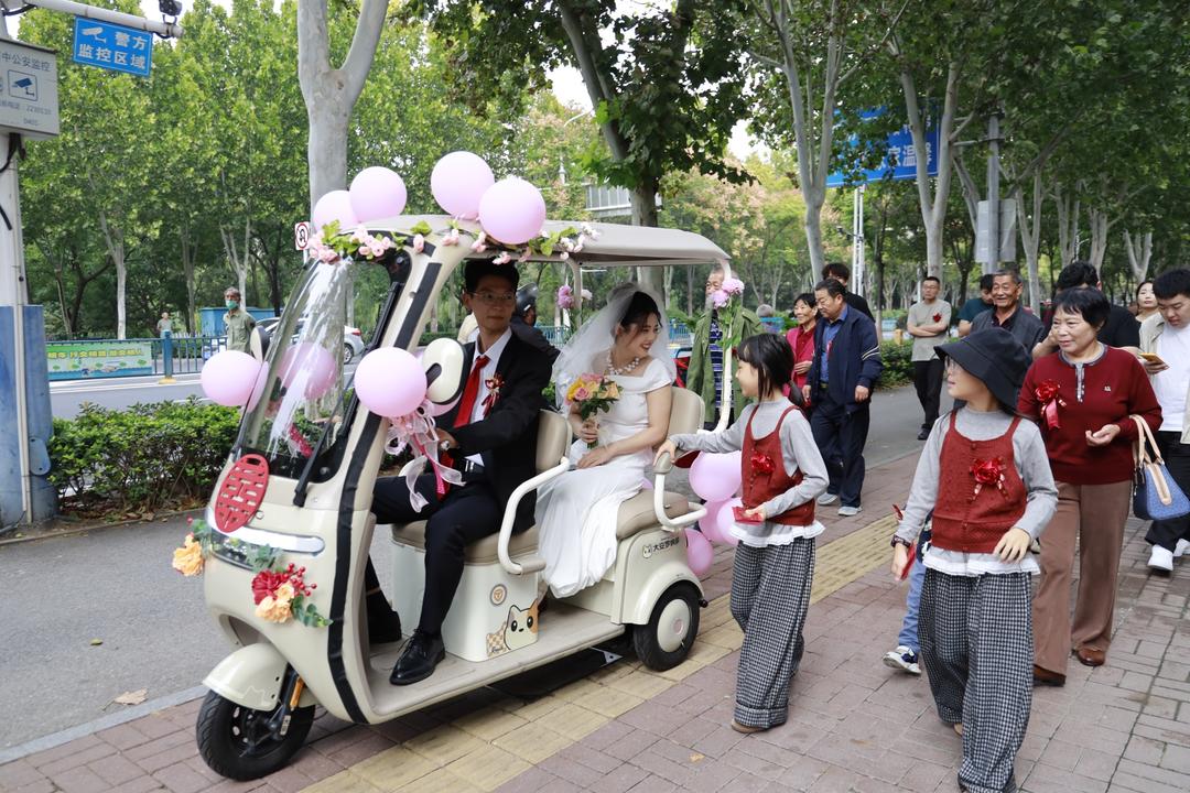 香槟色的电动三轮车,车头贴一个红“双喜”,车身绑上气球和鲜花,就成了亮眼的婚车。