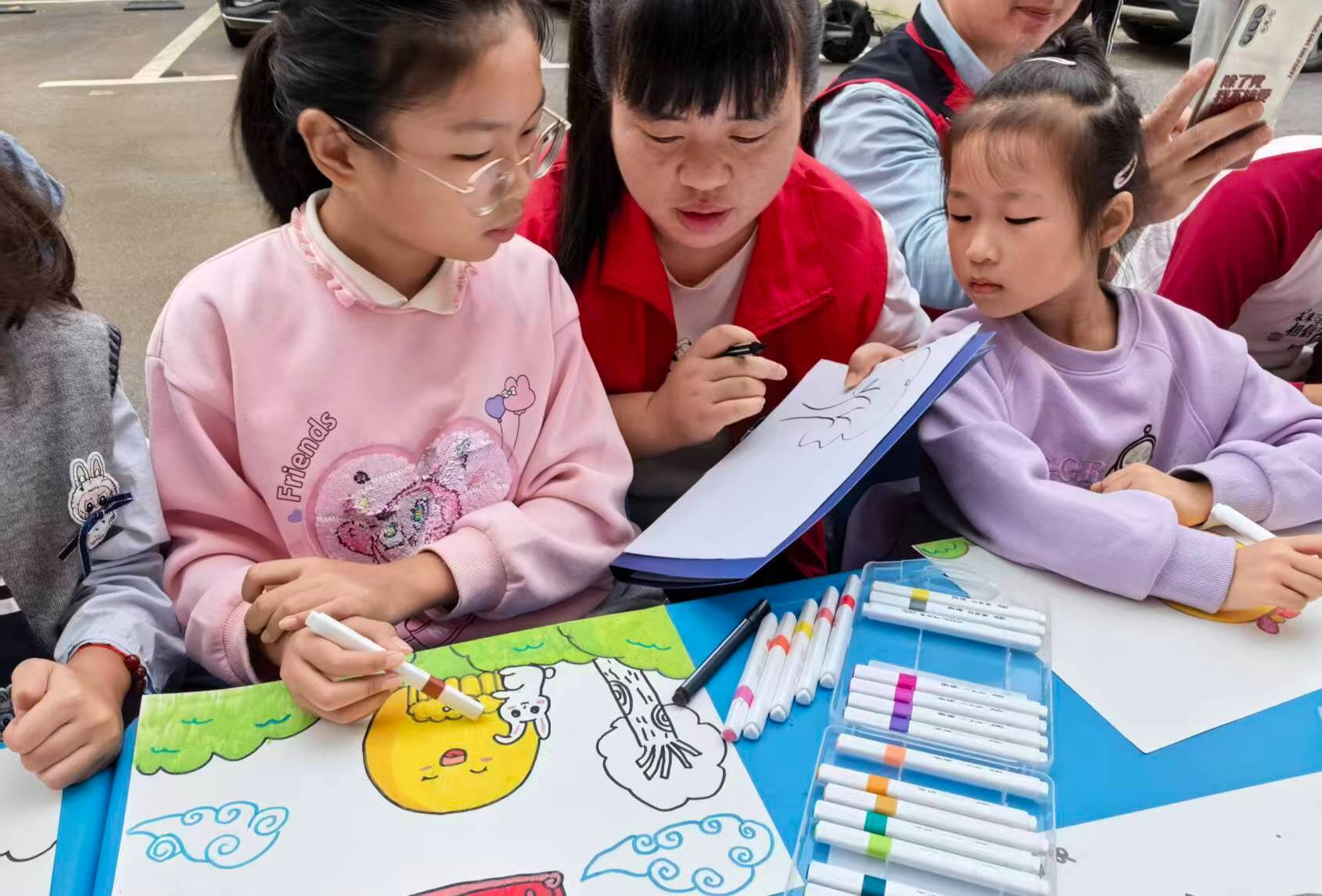 随后,单县义工协会的老师们带领孩子们开展了一场以月亮为主题的绘画体验活动。老师通过启发式的引导,鼓励孩子们围绕“心中的美好”展开想象,自由创作。孩子们纷纷拿起画笔,在画板上描绘出心中的明月、团圆的家庭场景等等。一幅幅童趣盎然的作品,不仅展现了孩子们的想象力与创造力,也传递出他们对美好生活的向往与祝愿。