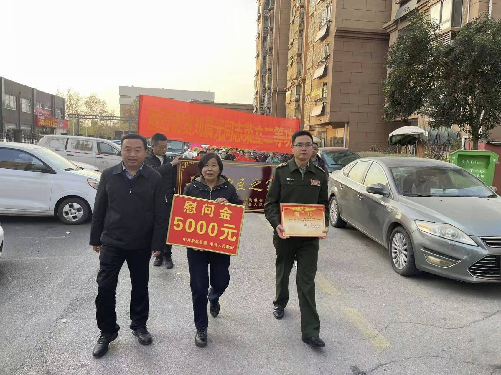 12 月 1 日,单县县委常委、人武部政委王飞带领县退役军人事务局、南城街道工作人员,专程为荣立二等功的单县籍军人刘晨光,开展送喜报活动。