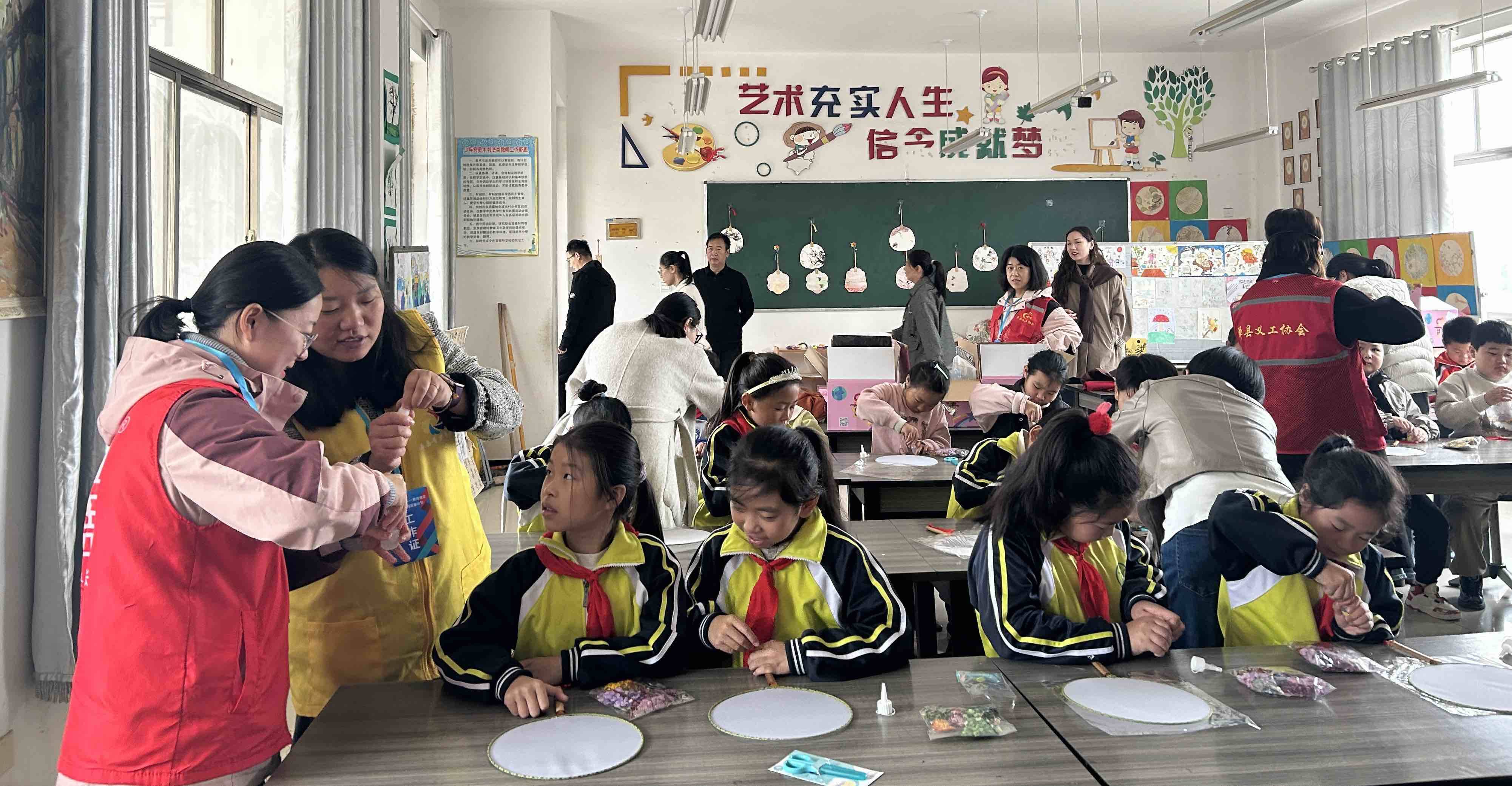 活动现场,捐赠代表为孩子们发放了精心配备的“艺暖包”,内含美术工具箱、非遗团扇等美育材料。孩子们接过这份温暖的礼物,脸上洋溢着灿烂的笑容,眼神中充满对艺术创作的期待。在美育实践环节,在志愿者的引导下,孩子们运用“艺暖包”中的材料动手制作团扇。他们不仅在实践中激发了想象力、锻炼了动手能力,更在创作过程中真切感受到艺术的魅力与乐趣。