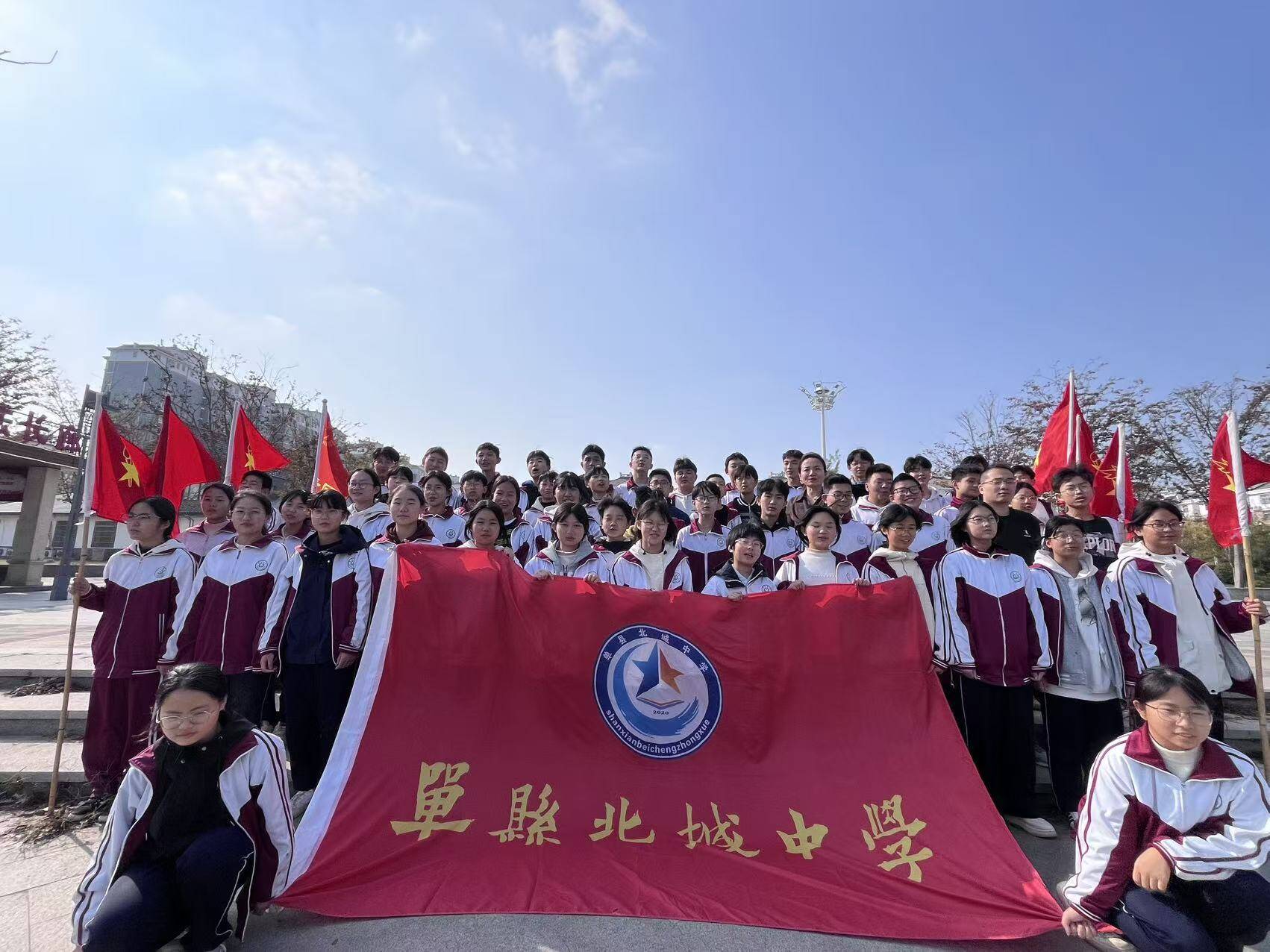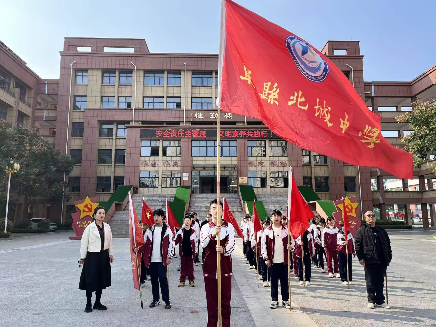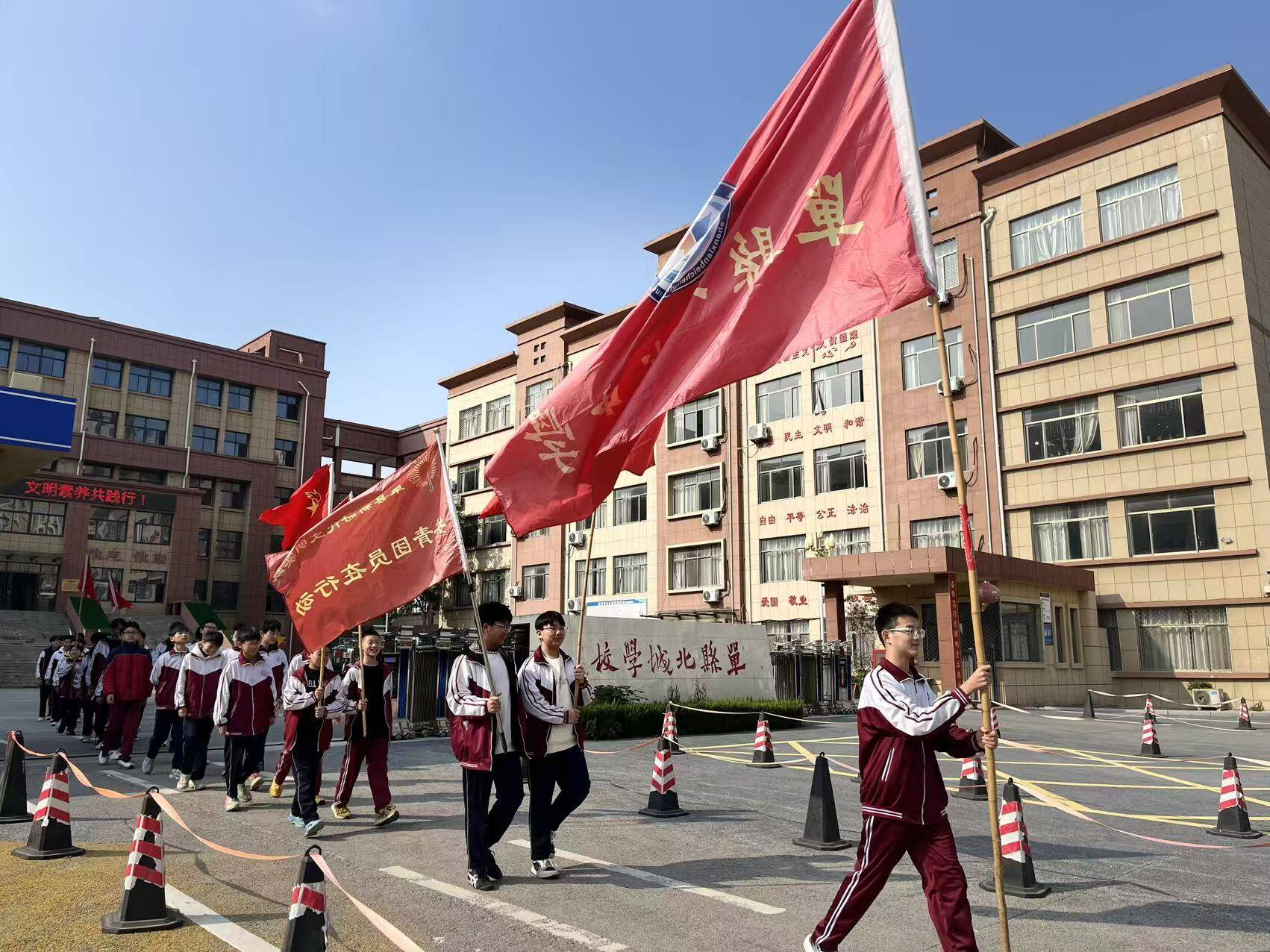 活动伊始,参与公益的学生们在办公楼前集结列队。鲜艳的校旗与队旗在阳光下猎猎作响,同学们身着统一校服,身姿挺拔如松,眼神中满是对公益行动的热忱与期待。这一刻,“奉献、友爱、互助、进步”的志愿精神在校园里悄然传递,为即将开启的公益之旅注入了满满的动力。
