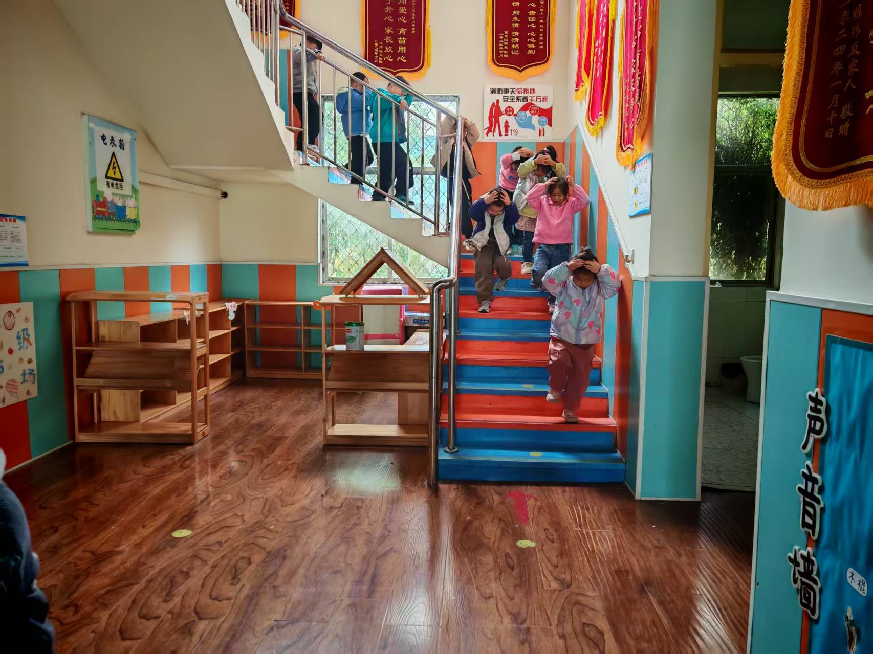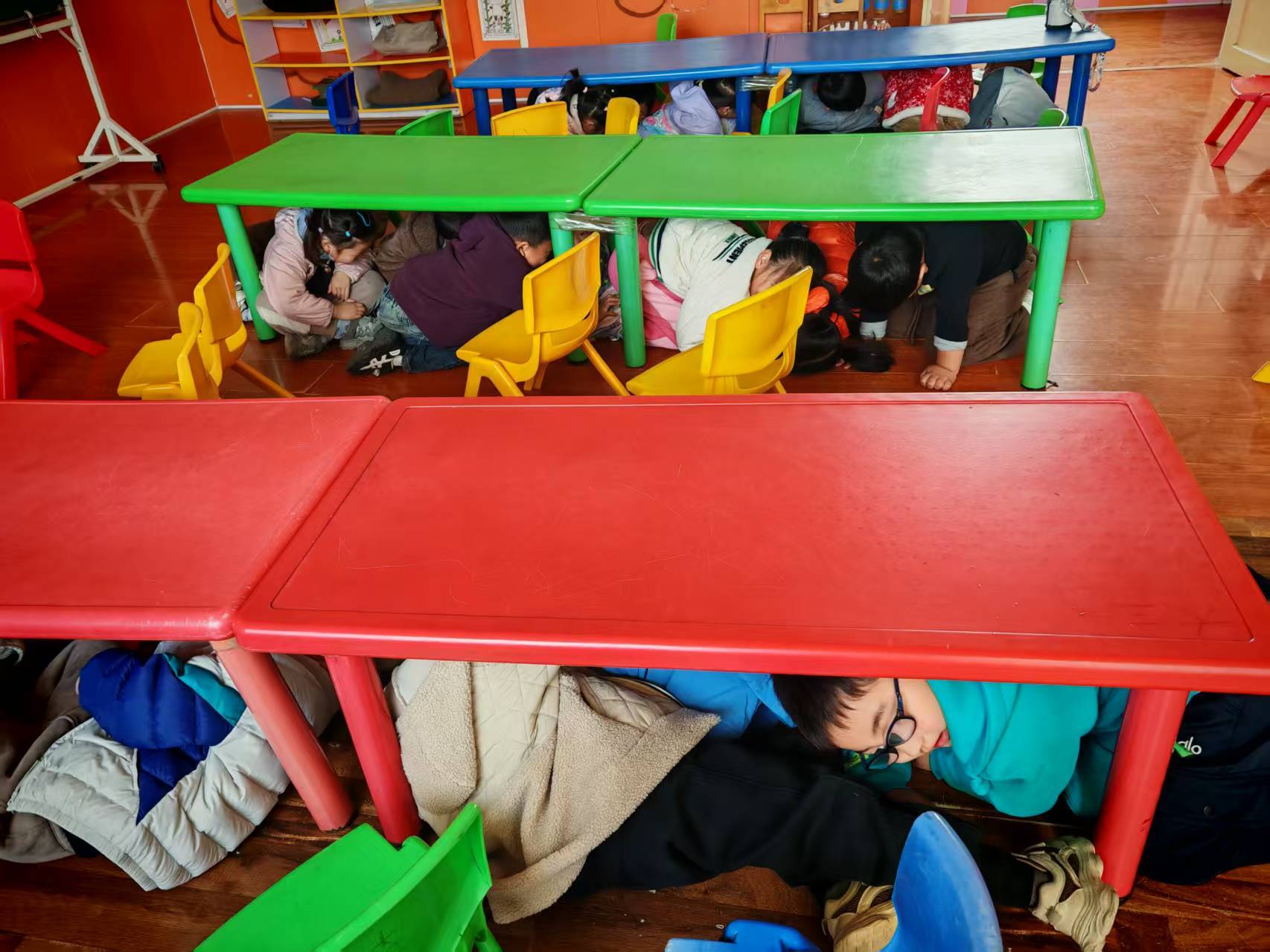 随着第一次急促的警报声响起,演练正式启动。在老师的沉着指挥下,全体幼儿迅速反应,立即停止活动,就近躲避到坚固的桌下、墙角等安全三角区,并用双手或软物护住头部。整个过程紧张有序,孩子们动作规范,展现了良好的心理素质和日常训练成果。