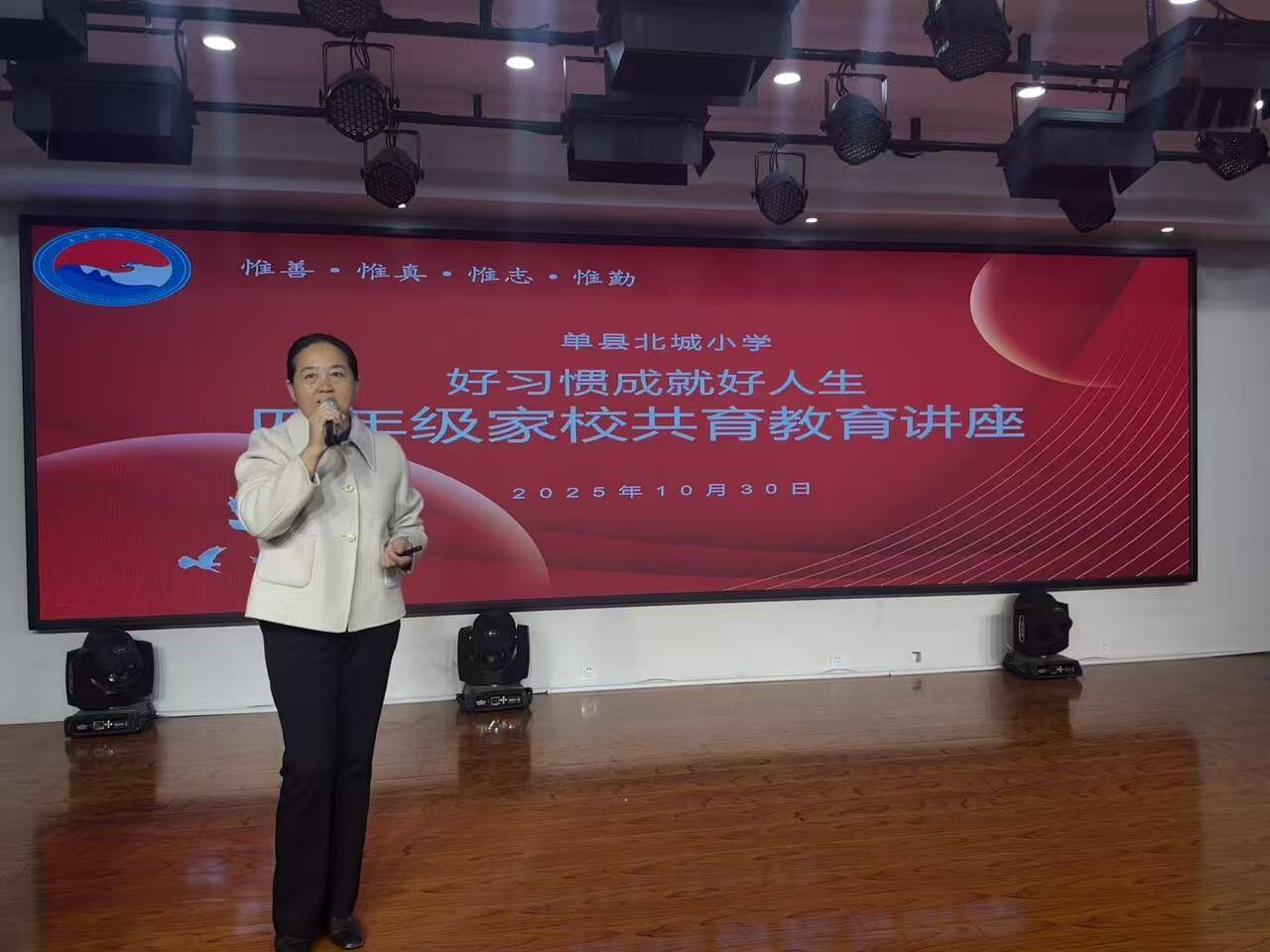 为深化家校共育,助力学生健康成长,10月30日,单县北城小学举行“好习惯成就好人生”主题家庭教育讲座,特邀资深教育专家贾春玲老师担任主讲,四年级全体家长齐聚一堂,共同聆听习惯培养的教育智慧分享。