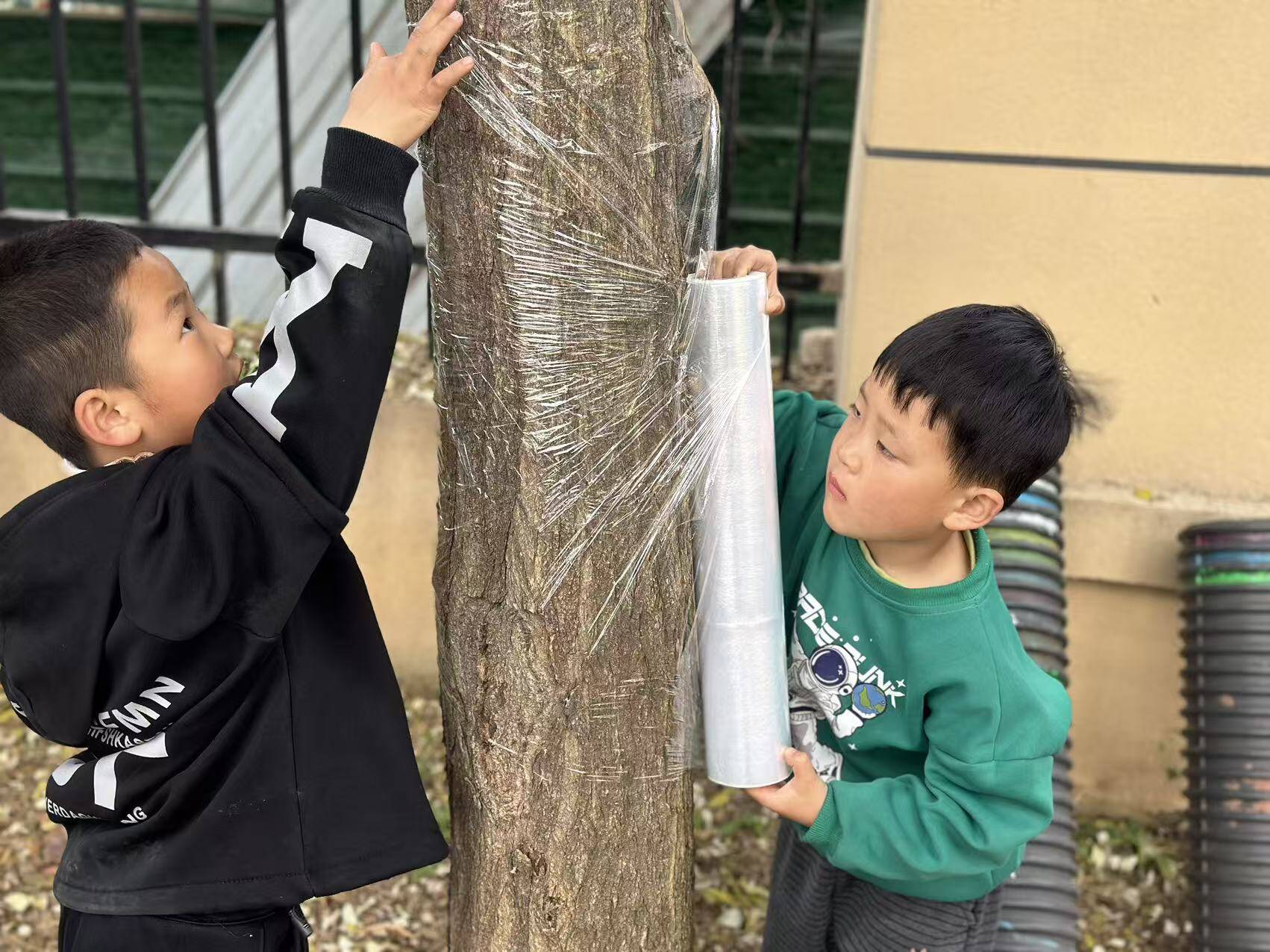 此外,中班级部还开展了“给大树穿新衣”活动,孩子们通过缠绕、粘贴、绘画等方式为园内树木进行防寒保护,不仅增强了动手能力,也在实践中树立了尊重自然、爱护环境的意识,体现了人与自然和谐共处的传统生态观。