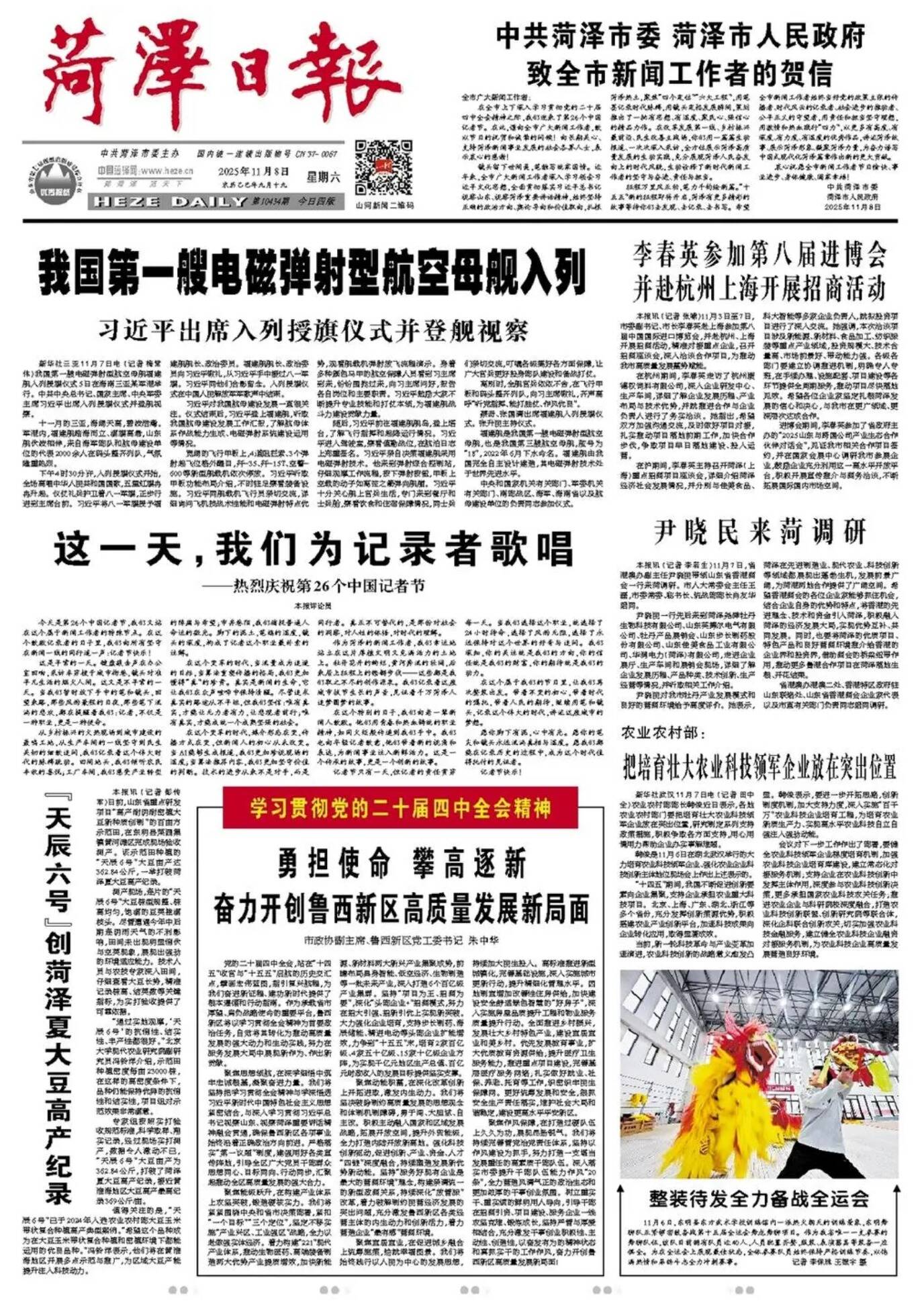 在全市上下深入学习贯彻党的二十届四中全会精神之际,我们迎来了第26个中国记者节。在此,谨向全市广大新闻工作者,致以节日的祝贺和诚挚的问候!向长期关心、支持菏泽新闻事业发展的社会各界人士,表示衷心的感谢!