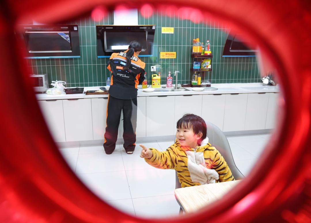 妈妈在共享食堂做饭,儿子小老虎开心得数着玻璃上的新年装饰,乐在其中。