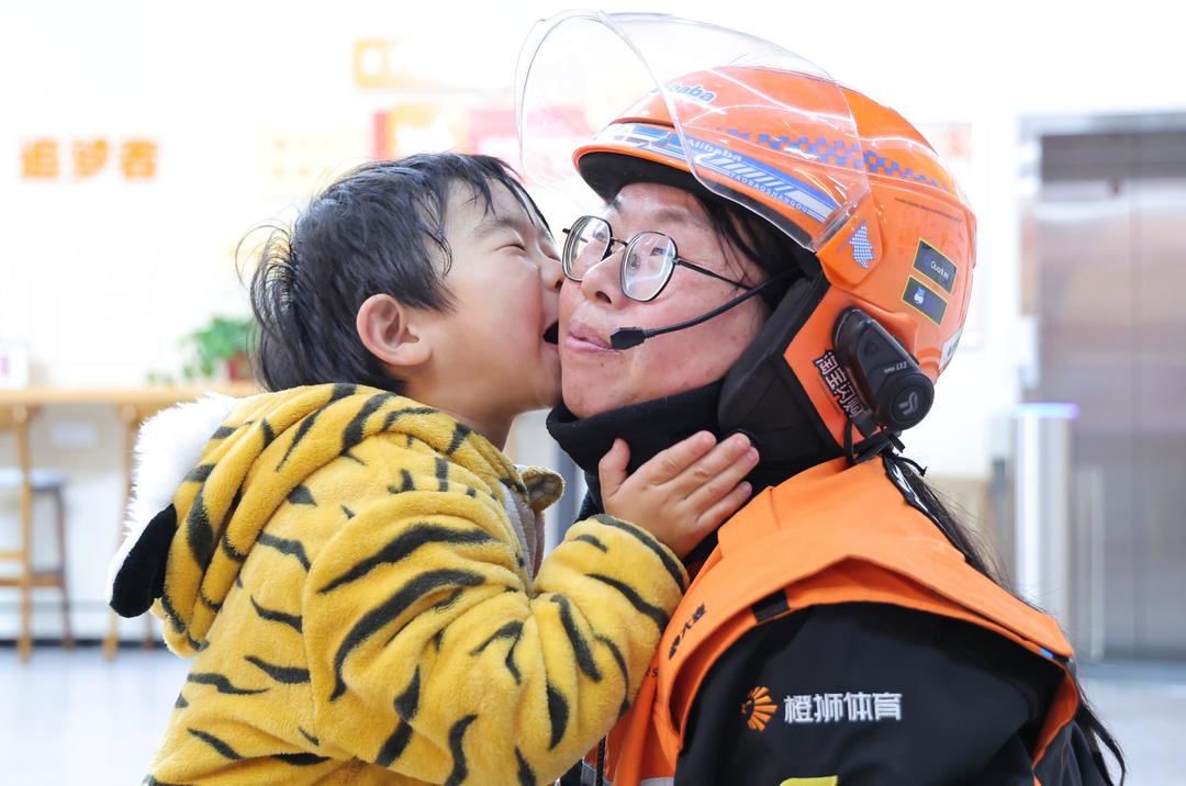 这位来自河南省遂平县、随丈夫来到山东生活的母亲,在离婚后独自带着15岁的女儿安妮和3岁的儿子小老虎在济南打拼。女儿平时忙于学业,小儿子则陪她一起风里雨里跑外卖,小老虎小的时候,就蜷在电动车座上睡觉。她爬楼送餐,心也一直悬在半空。小老虎稍大一点,就成了跟在她身后跑上跑下的“小尾巴”。