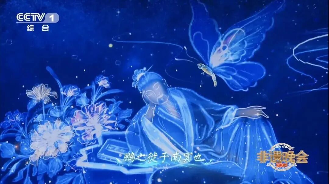 山东省节目歌曲《逍遥游》以国家级非遗代表性项目庄子传说中的“庄周梦蝶”典故为蓝本,挖掘其中“物我交融、自然共生”的文化内涵,由助演嘉宾刘惜君、国家级非遗代表性项目山东古筝乐(省级代表性传承人祝妍芳)、高密扑灰年画(市级代表性传承人吕虹霞)、琉璃烧制技艺(现场展示6件灯工琉璃作品及1件琉璃裙)、海阳大秧歌(省级代表性传承人许兆河等13人)联袂展演。节目中,舞者身着非遗琉璃服饰轻舞蹁跹,VR、AR技术与仿生装置串联起虚实景致,“庄周梦蝶”的千古哲思唯美呈现。节目将齐鲁非遗的匠心技艺与古典文化意境完美融合,打造出兼具艺术性与文化性的特色节目,彰显山东非遗守正创新、薪火相传的传承活力,也为晚会注入浓郁的鲁韵文化气息。