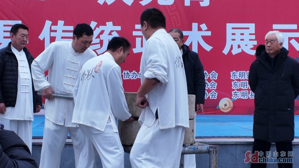 如果说民俗文化展演是温情的回望,那传统武术展演就是一场底蕴的厚积薄发。作为“武术之乡”,东明的武术文化源远流长,早已融入这片土地的肌理。四德广场上,梅花拳的舒展、佛汉拳的刚猛、炮拳与掌洪拳的凌厉交织在一起,刀枪剑戟的撞击声此起彼伏,听得人热血沸腾。双手插进百斤石磙、合力拔起千斤磨盘、单掌劈断砖块……引得里三层外三层的观众喝彩声一浪高过一浪。这一幕幕不仅震撼了现场,更顺着手机屏幕传向四方。此刻的东明,不仅有老物件诉说的似水柔情,更有武术之乡的铮铮铁骨。