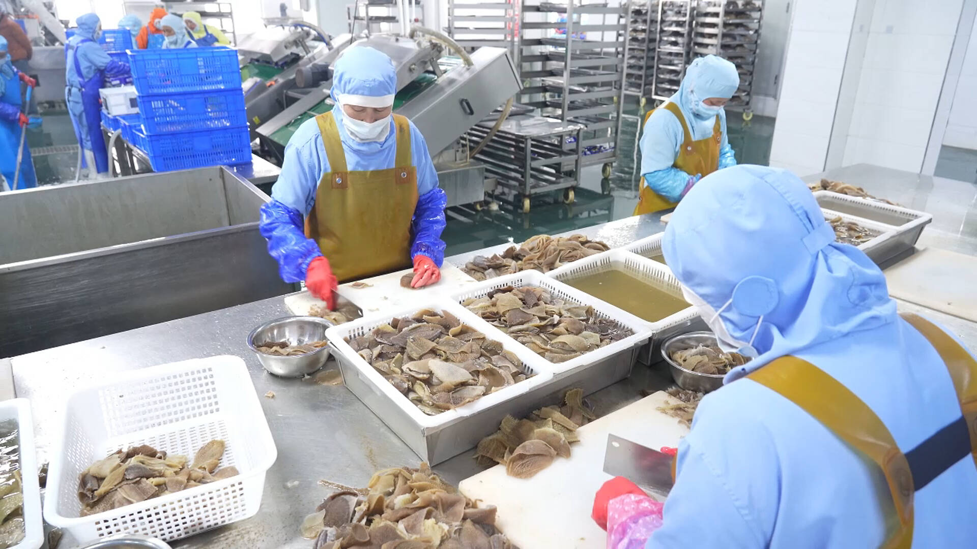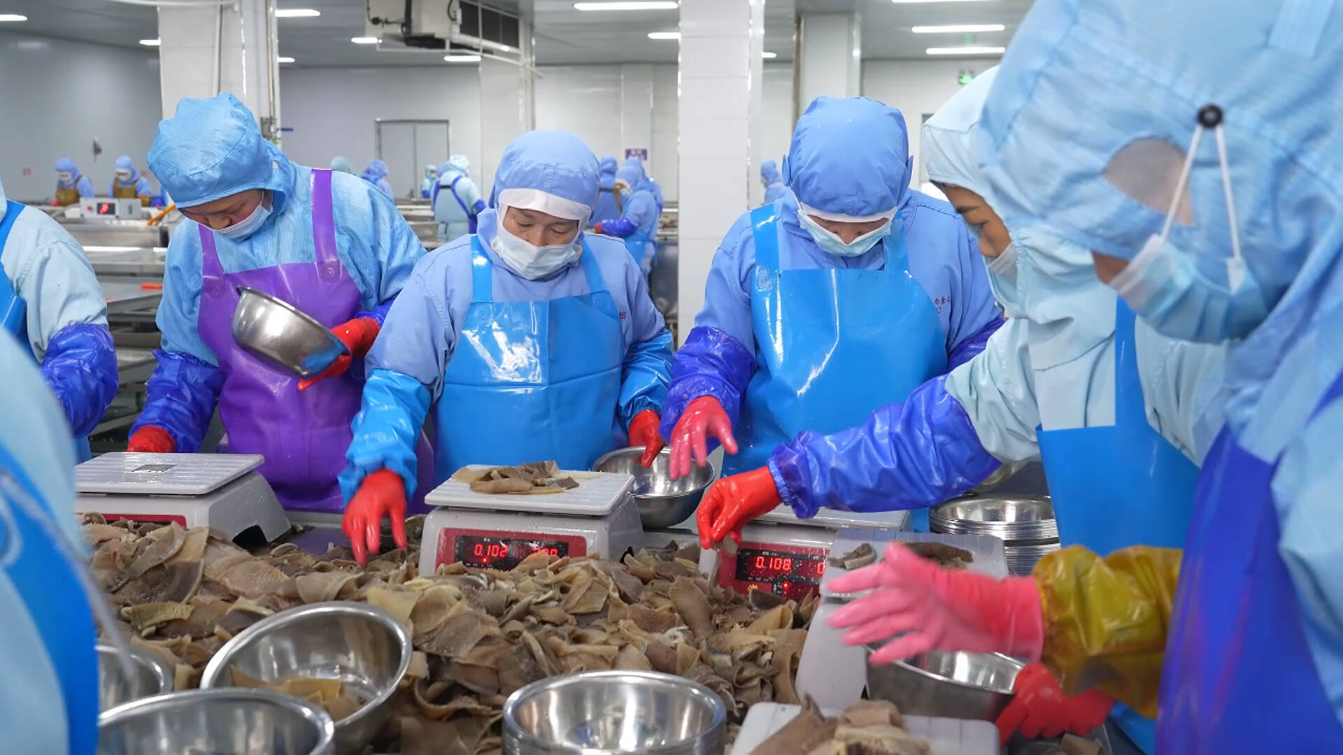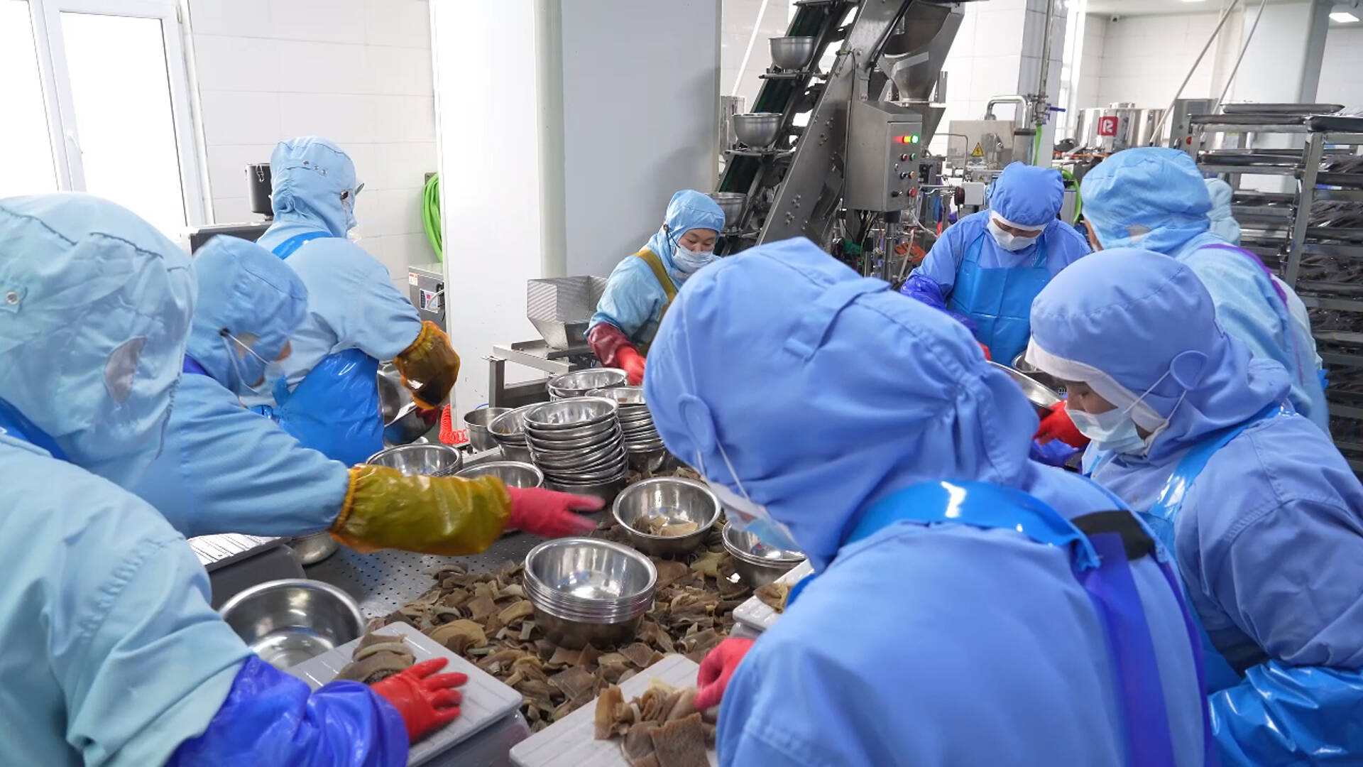 生产一线即是攻坚一线。在山东牛德尚食品生产车间内,自动化生产线高效运转,各环节工作人员分工协作、有序作业,毛肚产品经分装、封装、打包后,快速发往全国市场。