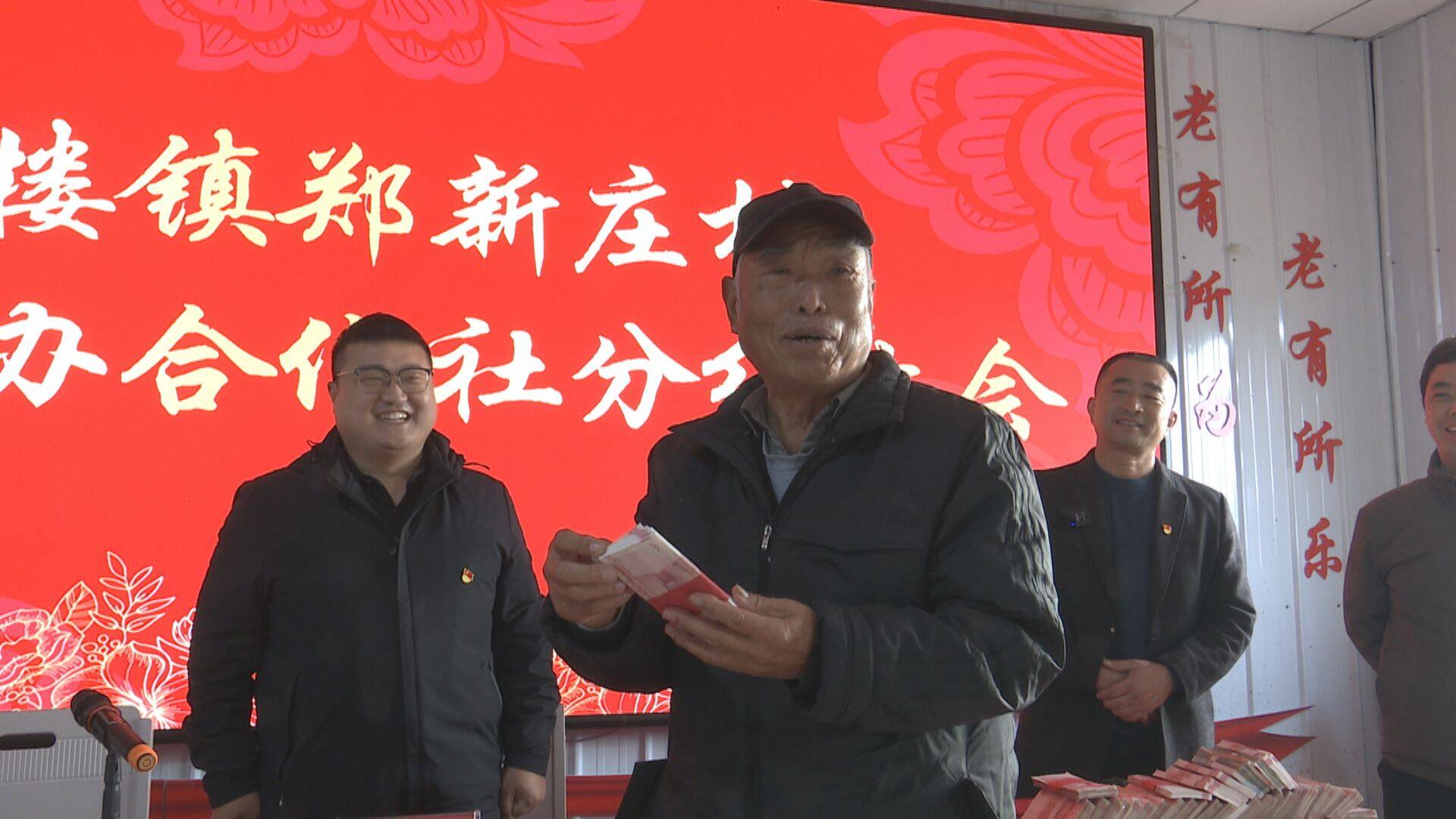 单县时楼镇郑新庄村党支部书记 郑其玉:我们全体社员在一年的共同努力下,创收了80余万元,为我们76户社员发放现金53万元。剩余资金一部分用于我们老年食堂运营资金,下一步就是再扩建厂房,用于我们冷库建设。