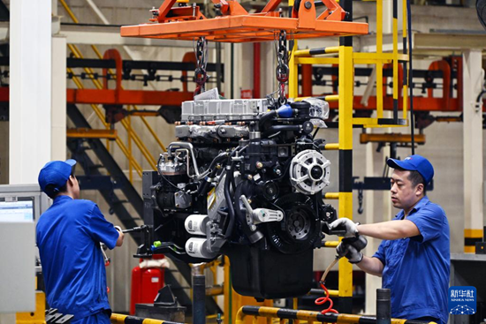 在潍柴集团车间内,工人在装配发动机(8月21日摄)。新华社记者 李紫恒 摄