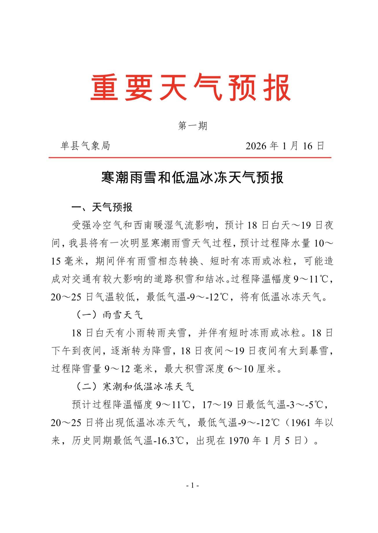 受强冷空气和西南暖湿气流影响,预计 18 日白天~19 日夜间,我县将有一次明显寒潮雨雪天气过程,预计过程降水量 10~15 毫米,期间伴有雨雪相态转换、短时有冻雨或冰粒,可能造成对交通有较大影响的道路积雪和结冰。过程降温幅度 9~11℃,20~25 日气温较低,最低气温-9~-12℃,将有低温冰冻天气。