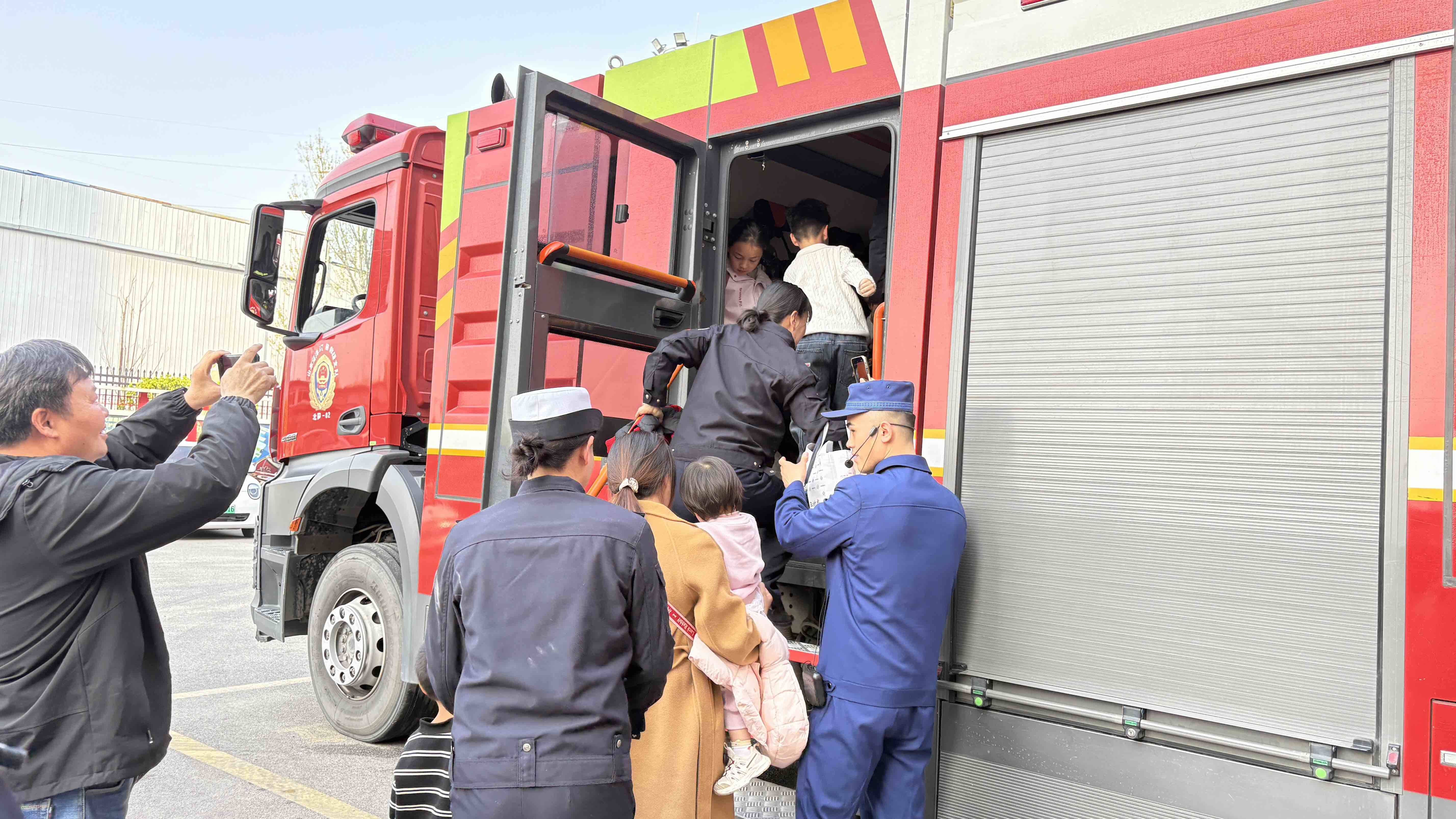 活动中,在消防宣传人员的引导下,参观人员依次走进营区、内务设置、接警中心、器材库,实地了解消防队伍建设、执勤战备工作,集中观看火灾警示案例,强化安全警醒意识。在车辆装备区,消防员对各类器材装备进行了专业讲解,并邀请家属和儿童登车体验,近距离感受消防装备实力。在互动体验环节,大家试穿灭火救援服、体验水带连接、模拟火场逃生,观看日常训练科目展示。安全小课堂围绕家庭防火、电动车充电、火场逃生及交通消防联动安全开展科普,内容贴近生活、实用性强,进一步提升了大家的应急避险能力。