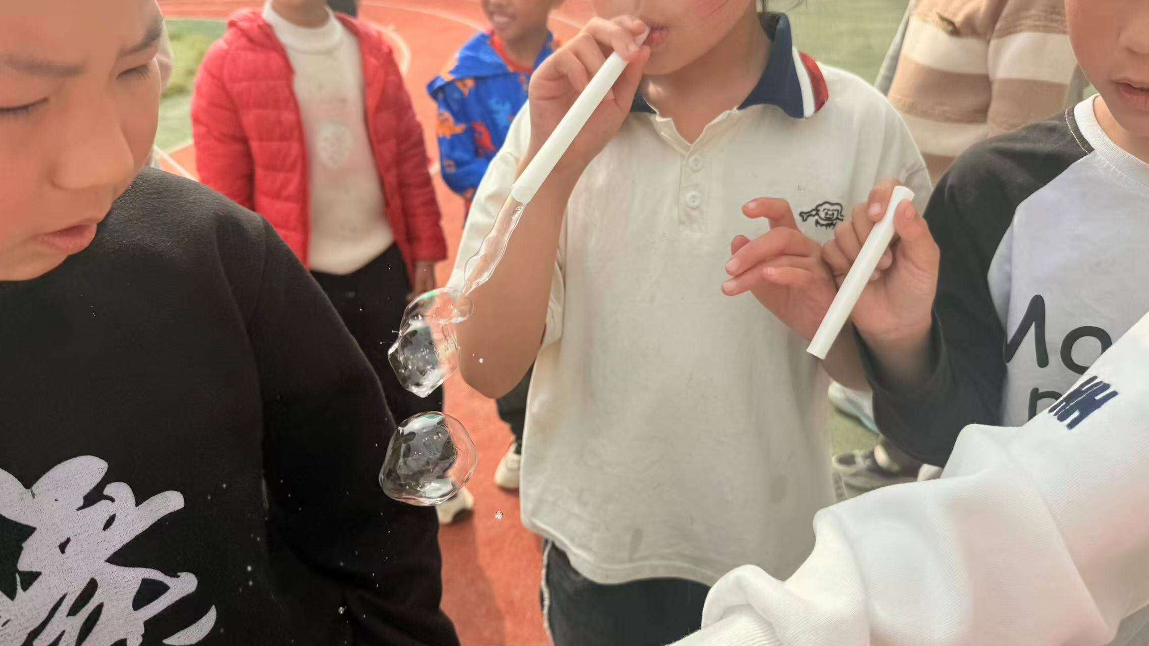 大家拿着自制的吹泡泡工具,轻轻一吹,五颜六色、大大小小的泡泡瞬间飘满教室,有的圆润透亮,有的连在一起,在阳光下格外漂亮。同学们还主动探索怎样能吹出更大、更稳定的泡泡,在玩耍中直观理解了表面张力的科学知识。